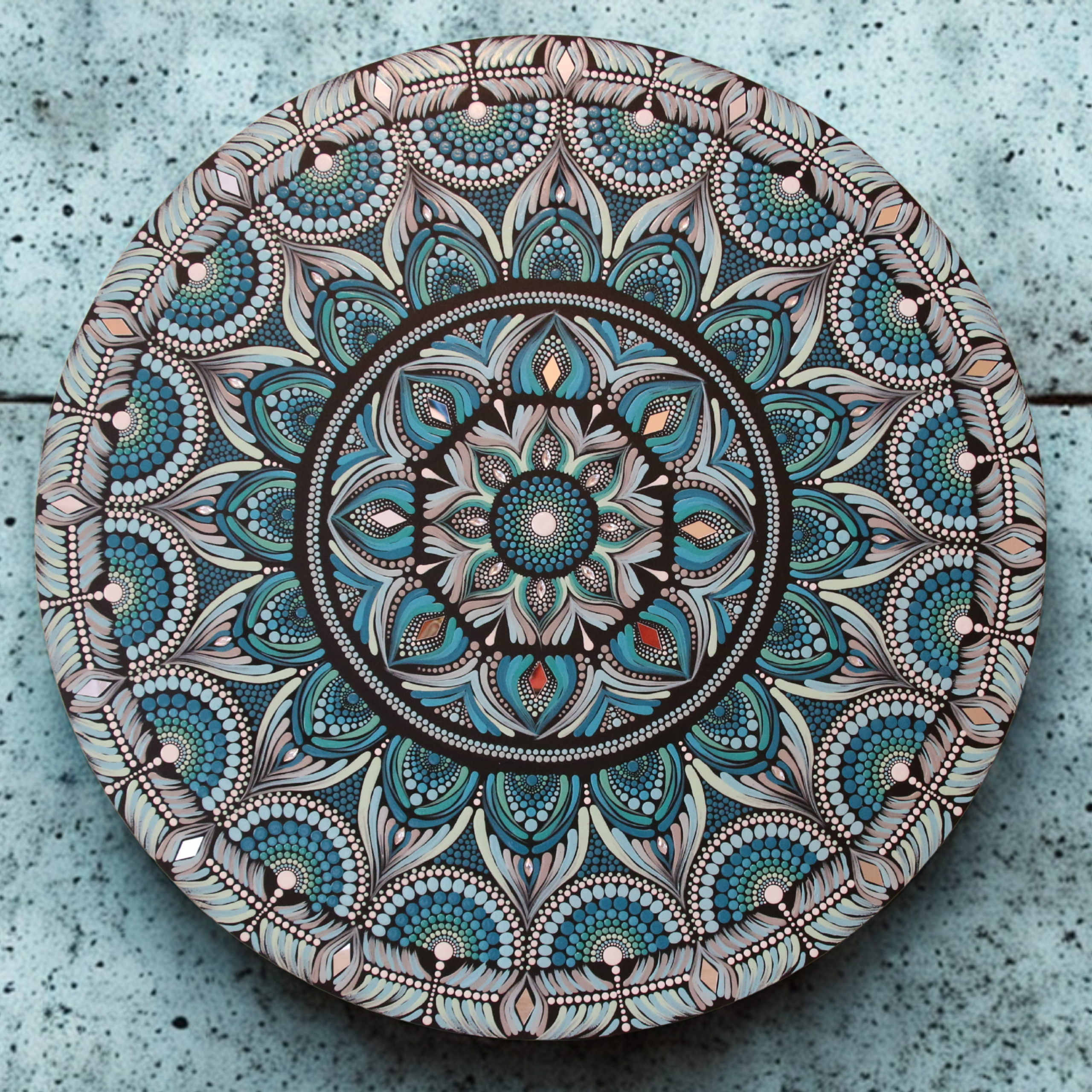 Accueilli dans un salon, une chambre ou un espace de méditation, ce mandala devient un portail de tranquillité : il apaise instantanément l’atmosphère, favorise le repos réparateur et soutient tout travail introspectif ou thérapeutique. Un véritable bain d’âme qui ramène à la fluidité et à la clarté.