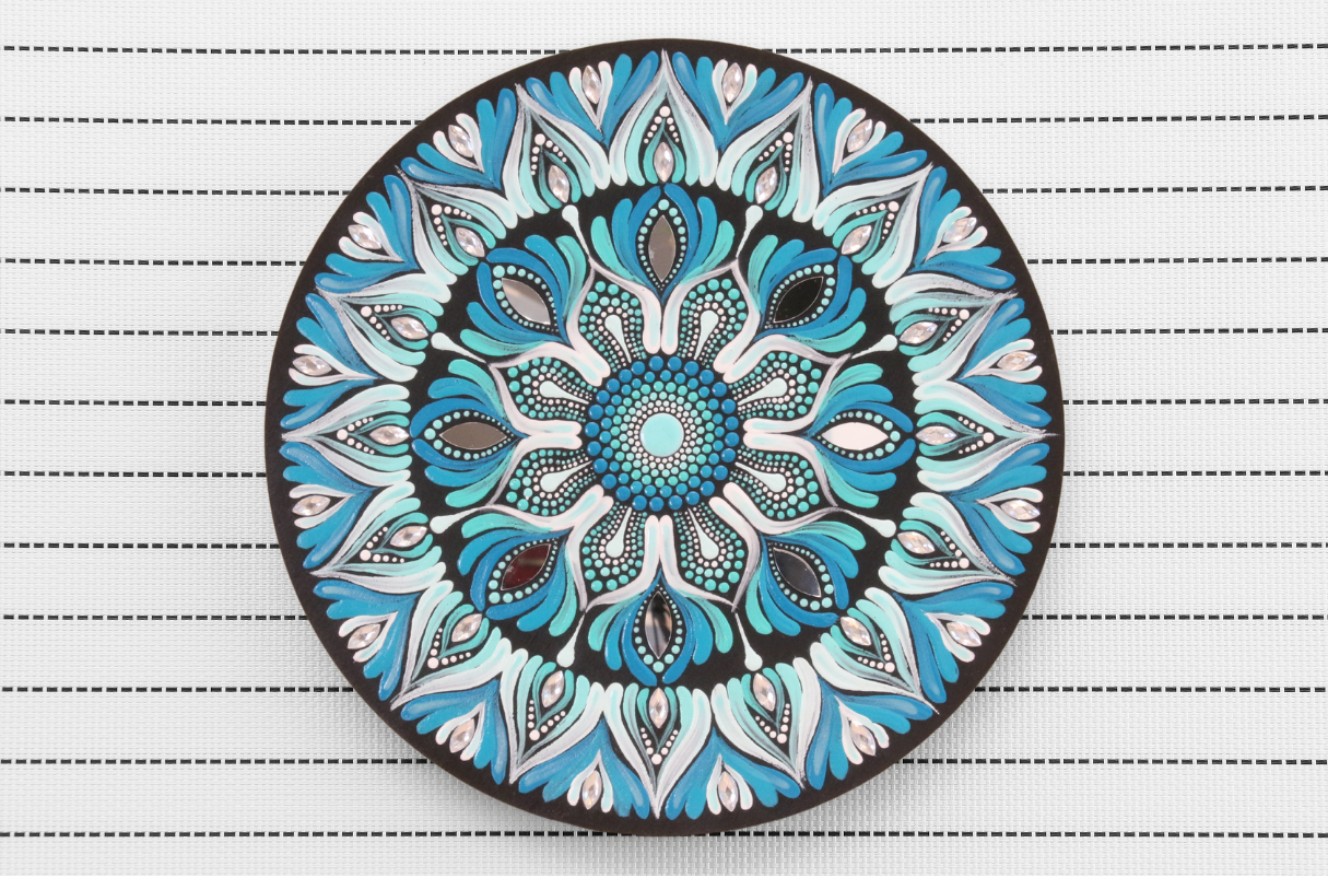 Ce mandala est une vague de pureté cristalline. Bleus profonds, turquoise et blanc lumineux s’épanouissent en lotus sur fond noir : il apaise profondément, purifie l’énergie et ramène clarté, calme et sérénité absolue.